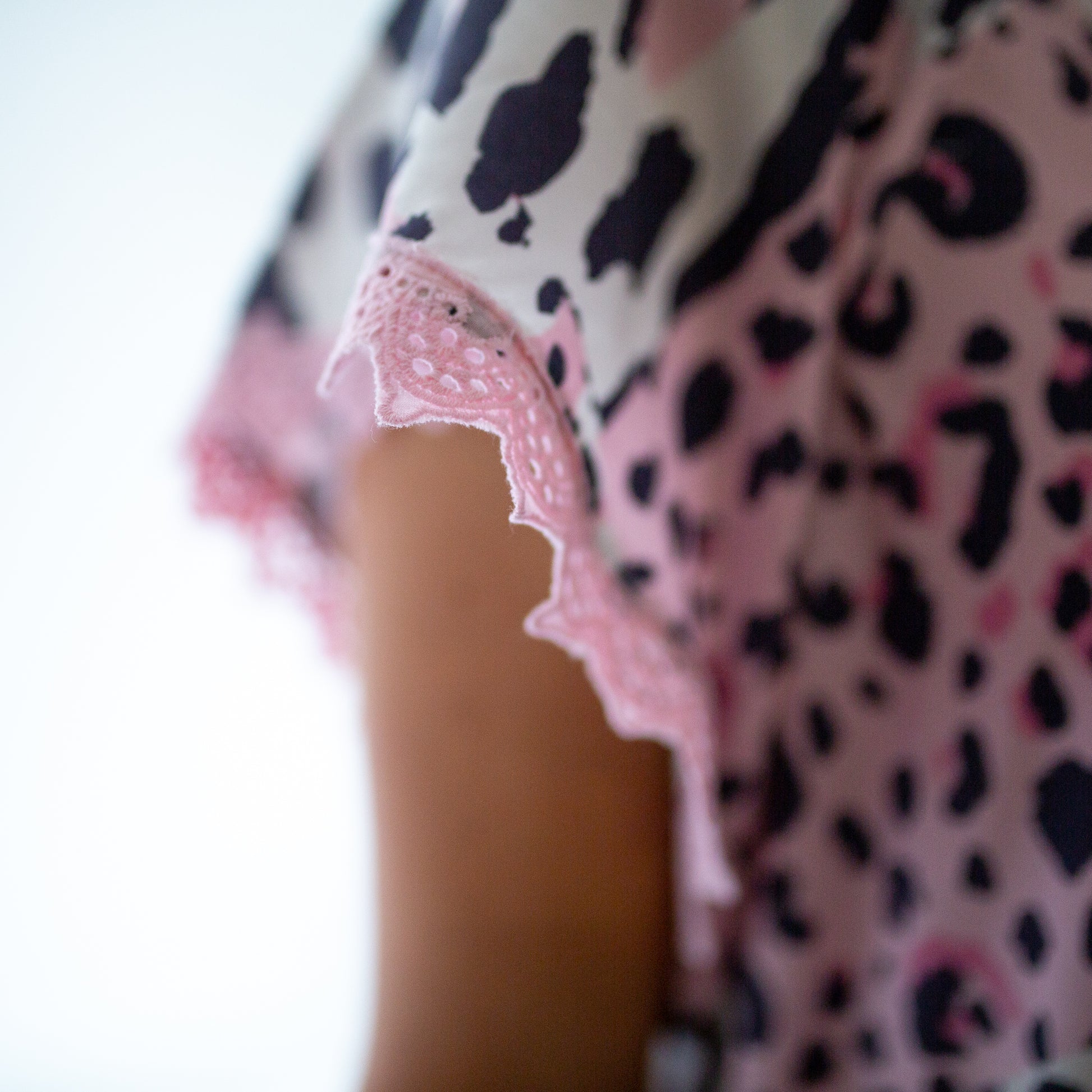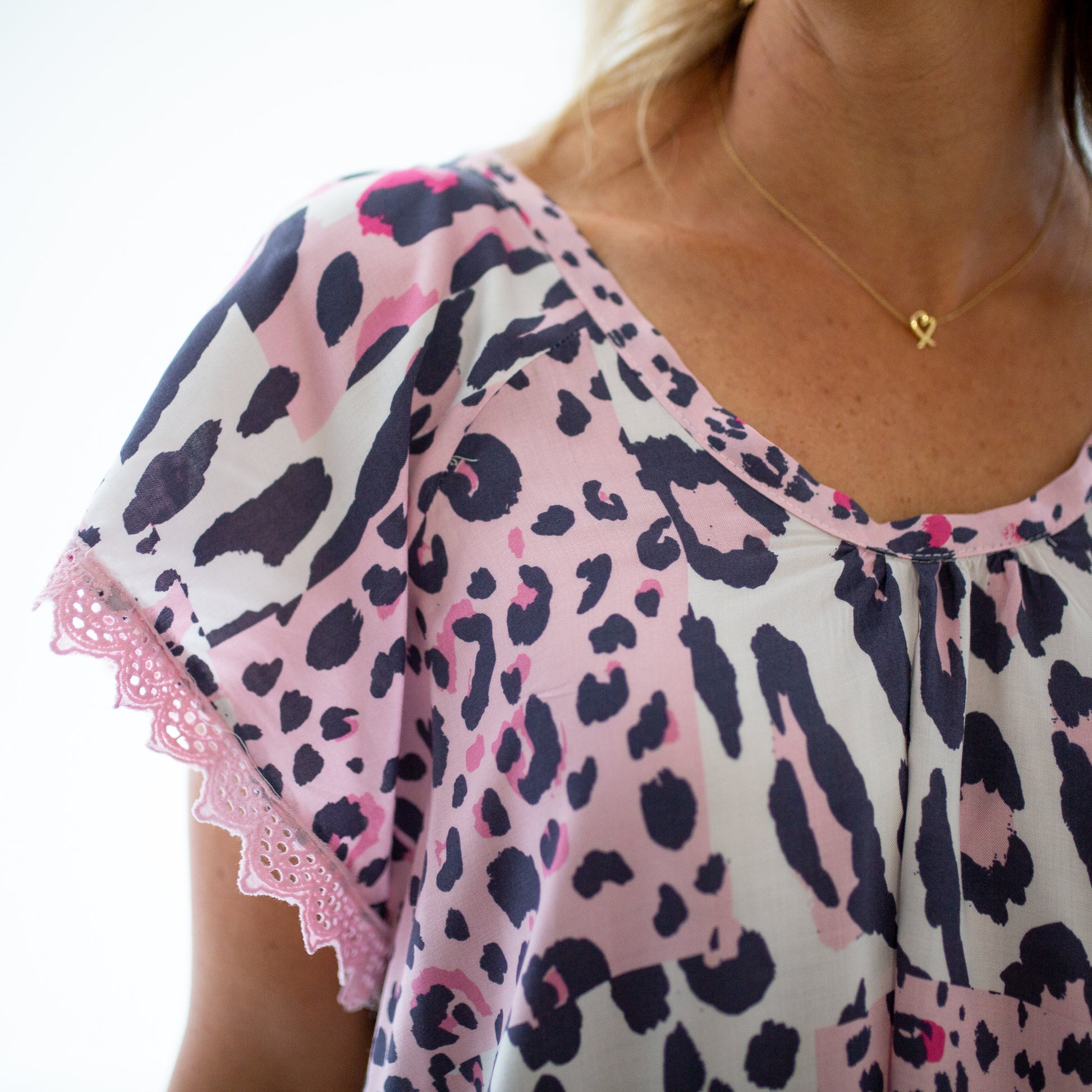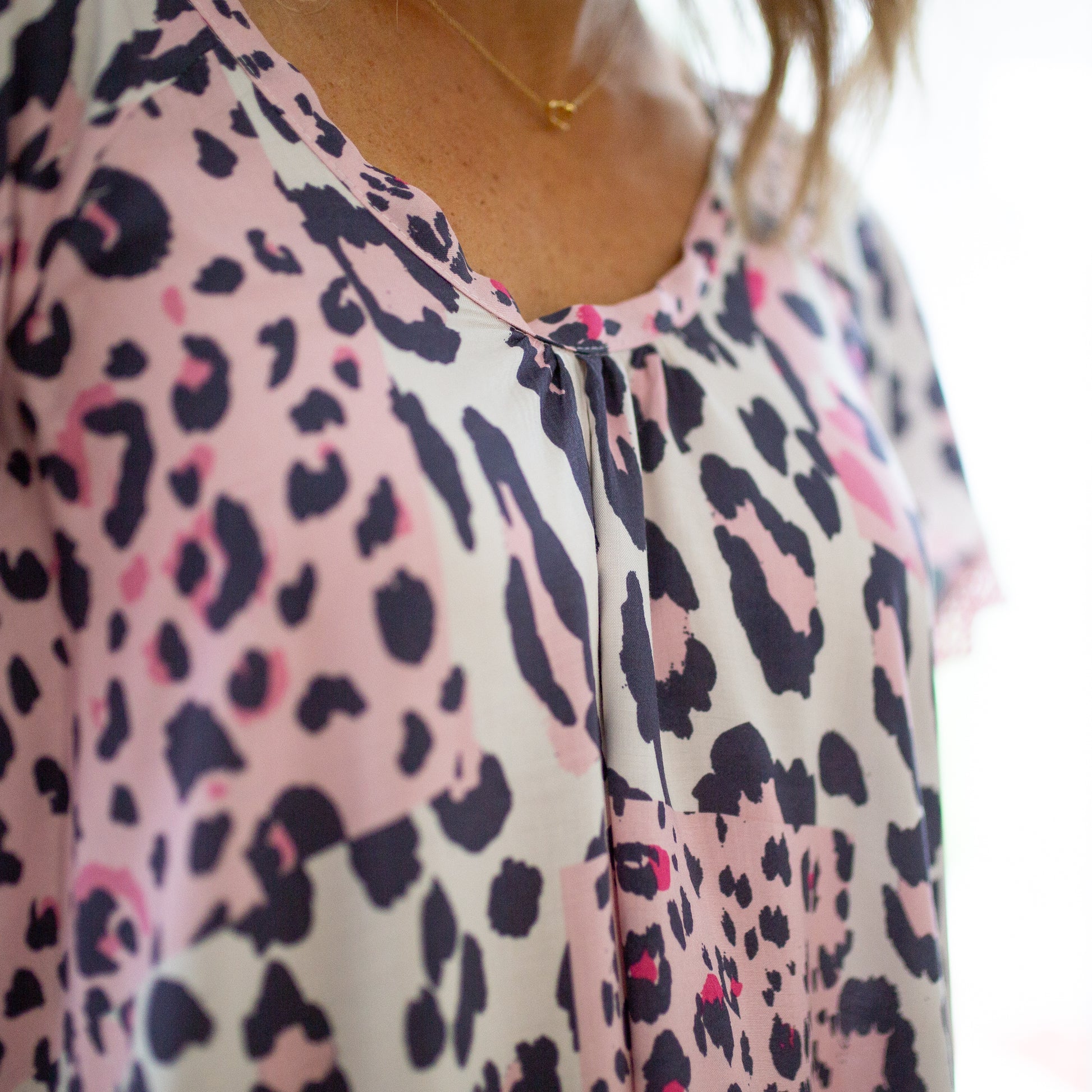 V-neck button down, with a short sleeve and soft elastic at the back to create shape.