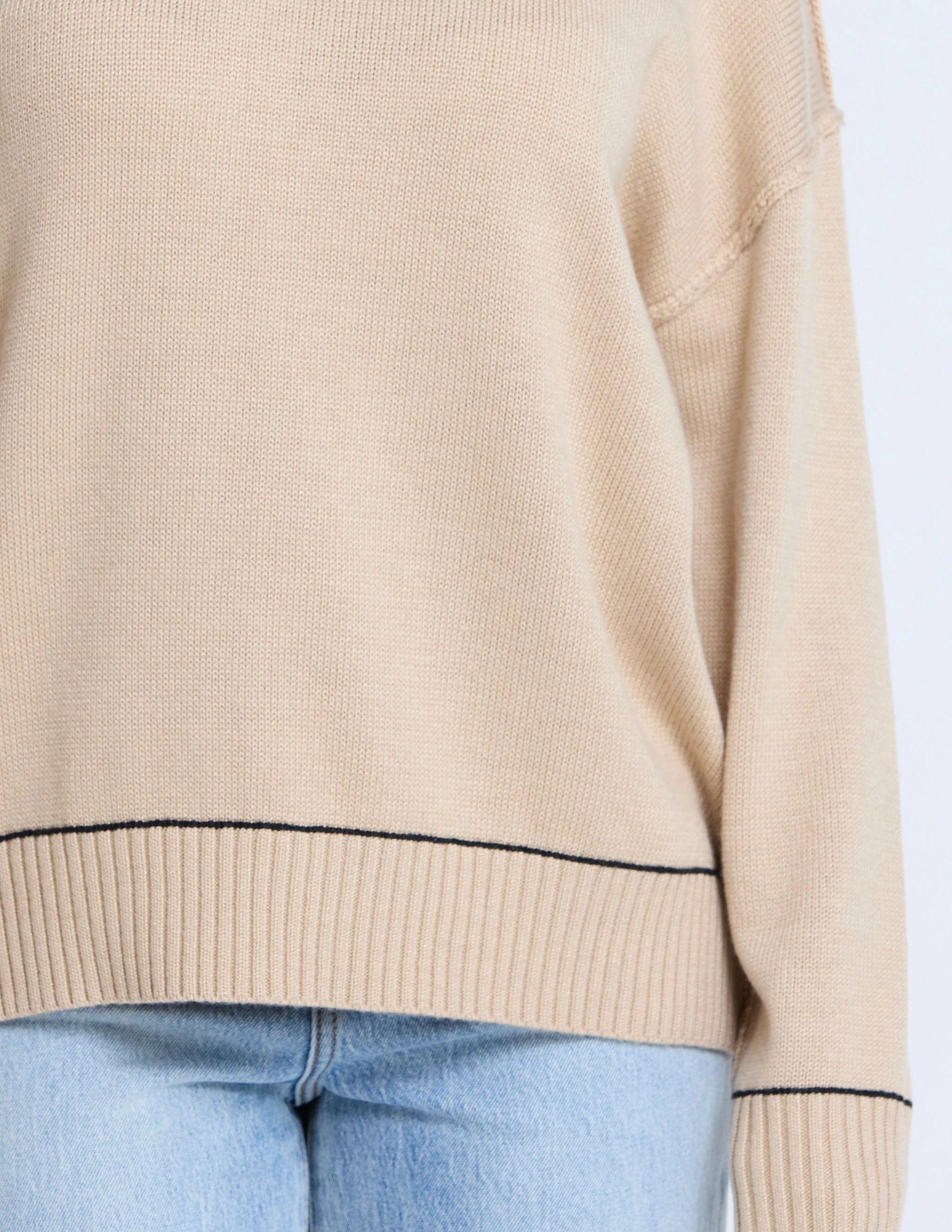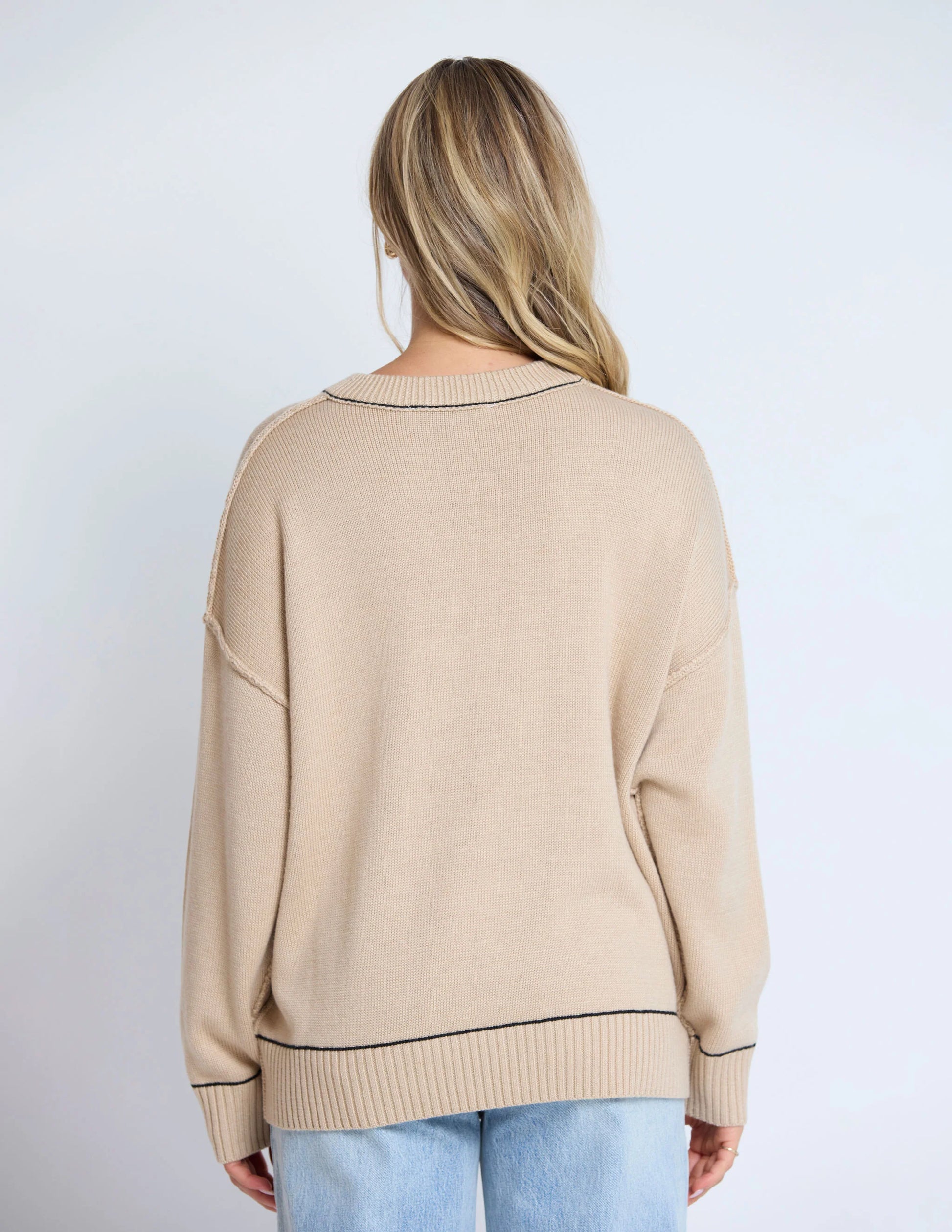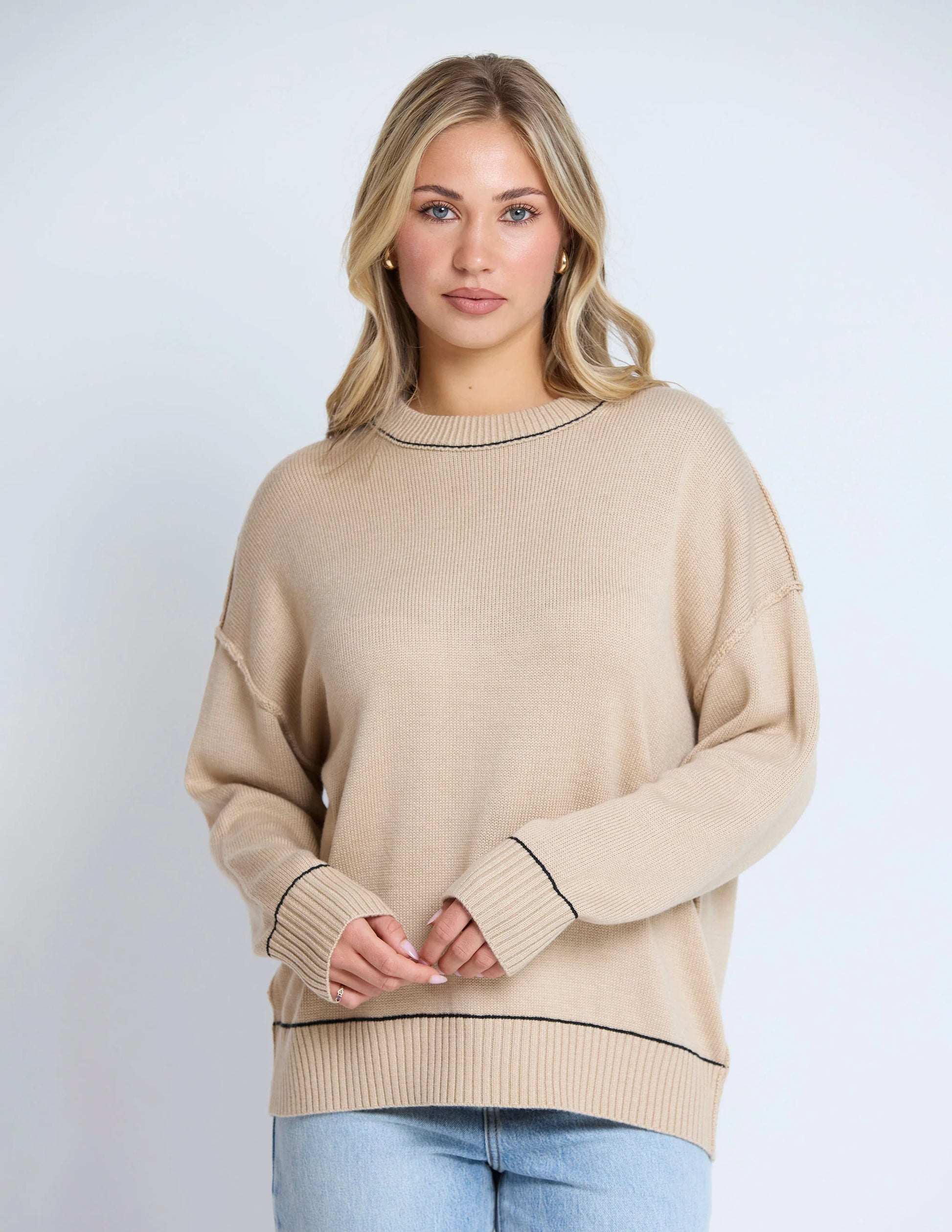 Relaxed fit crew neck knit in jersey knit with rib trims and contrast colour stitching detail.