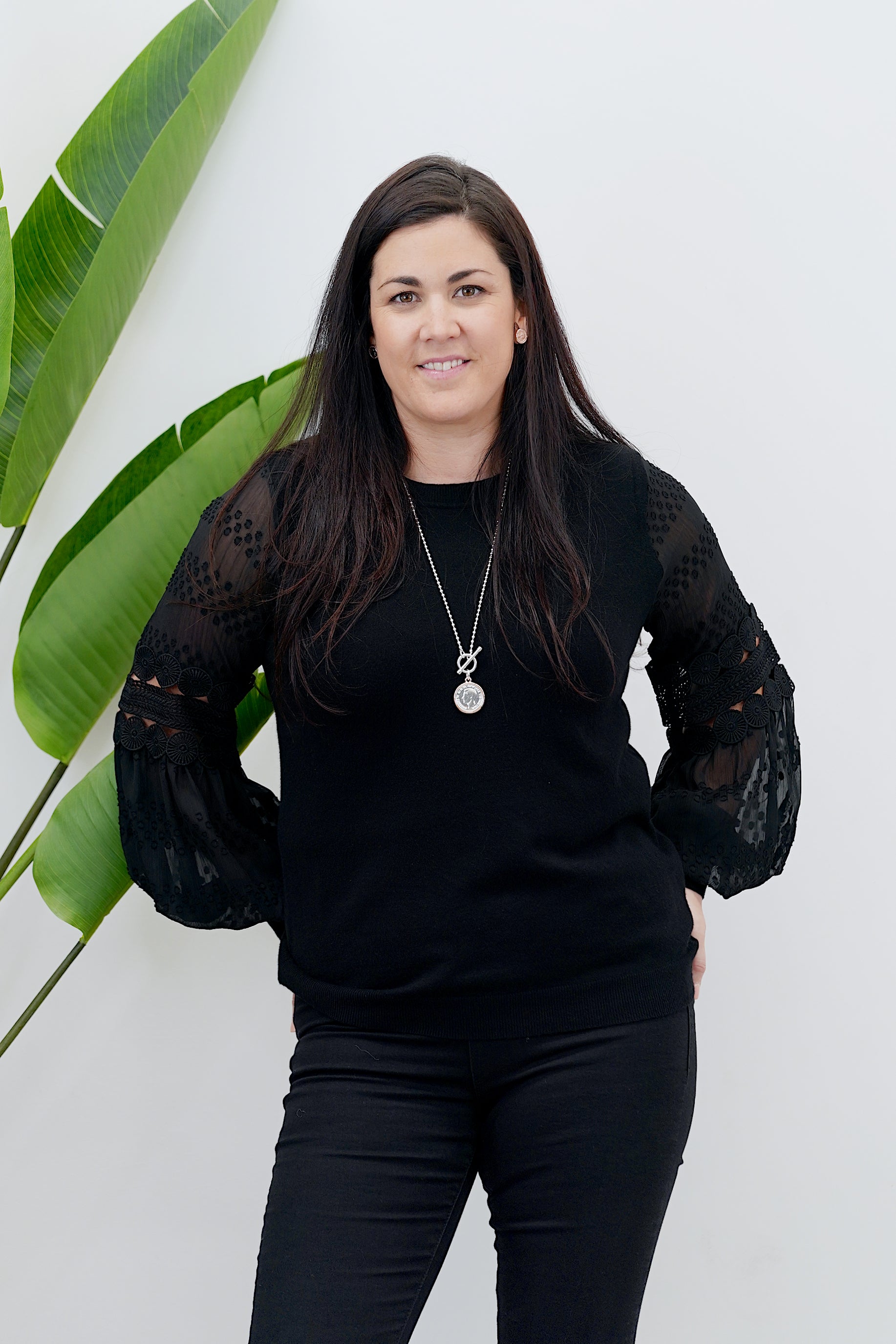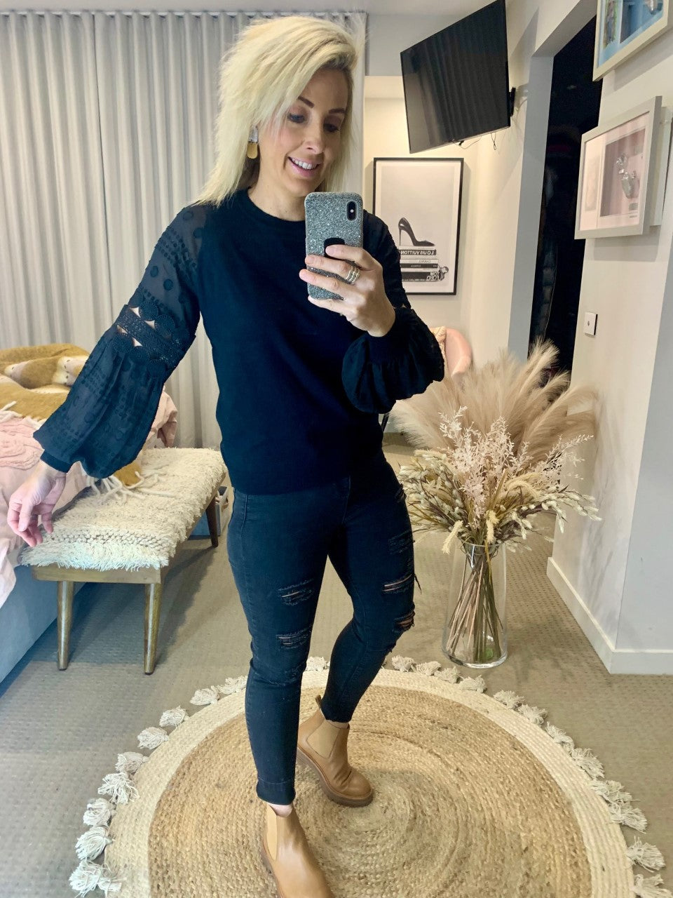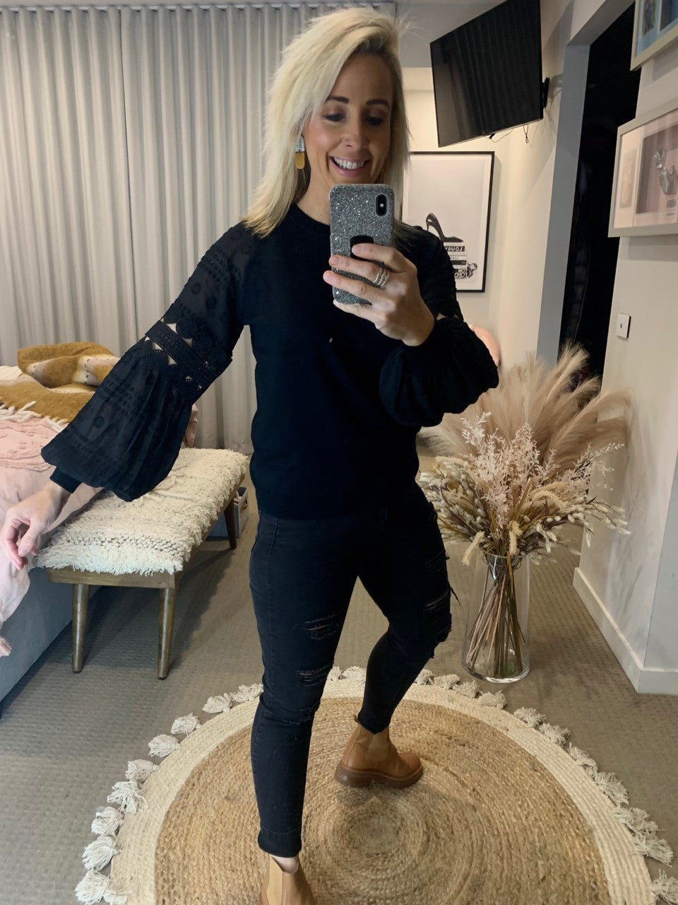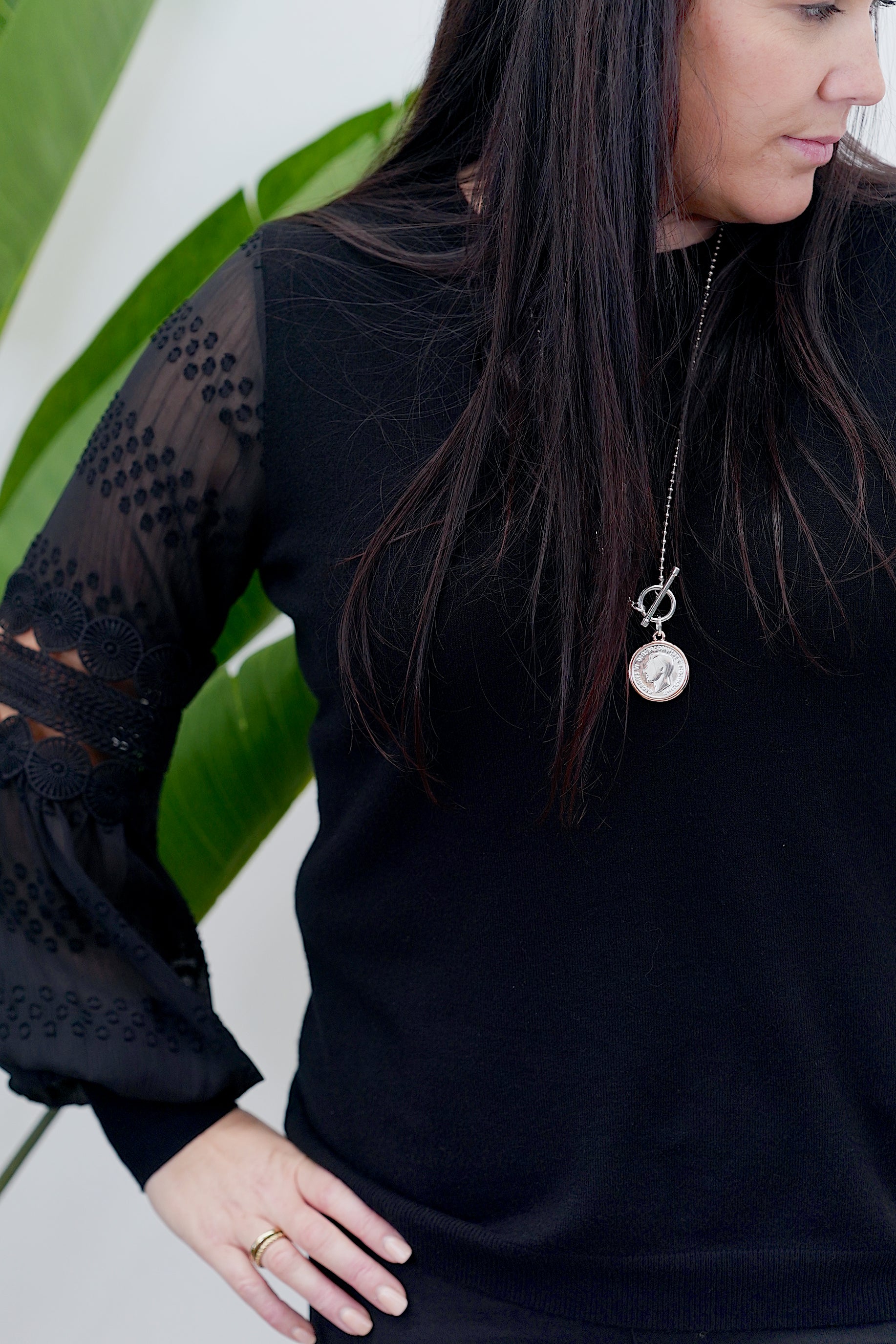 Long sleeve light weight knit jumper with a beautiful lace detail sleeve.