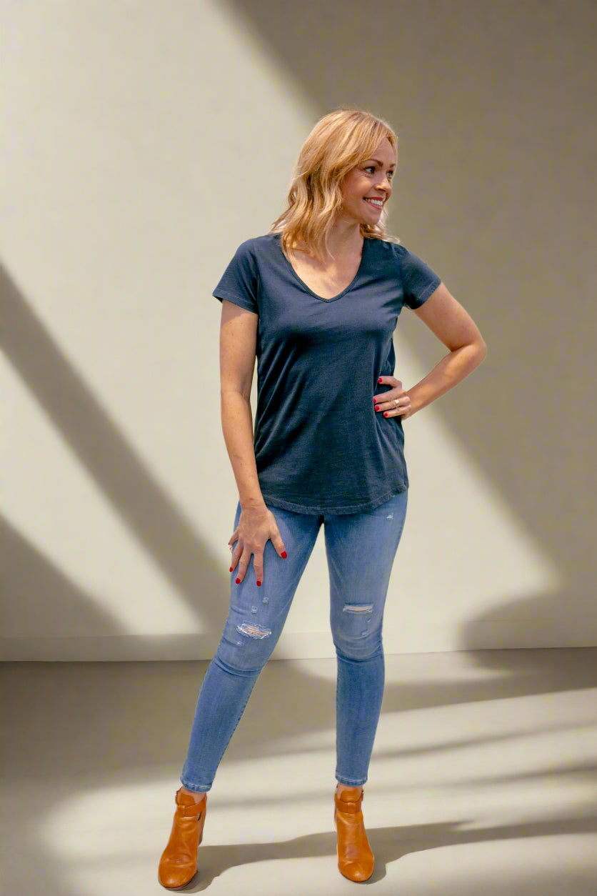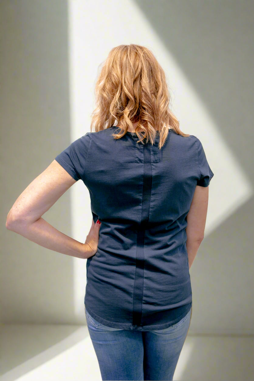 V-neck tee with a ribbed panel down the side of tee for extra stretch and comfort.