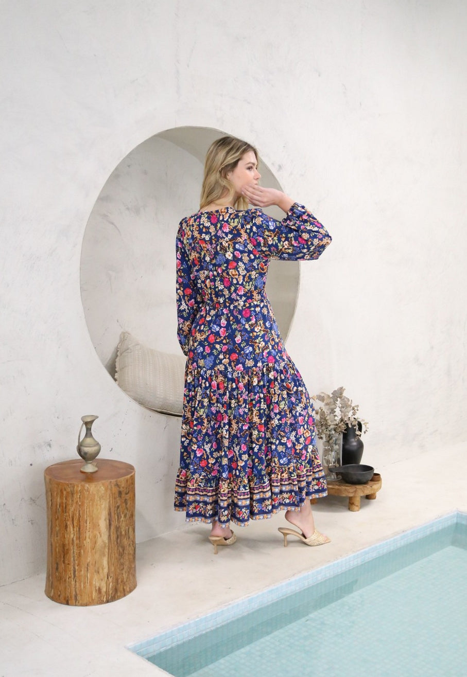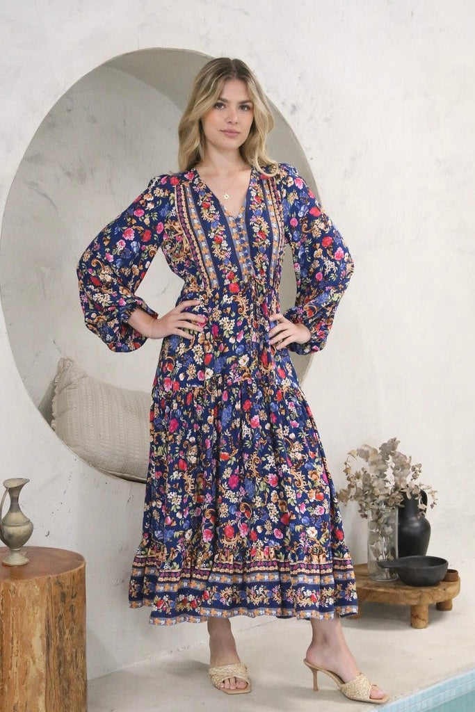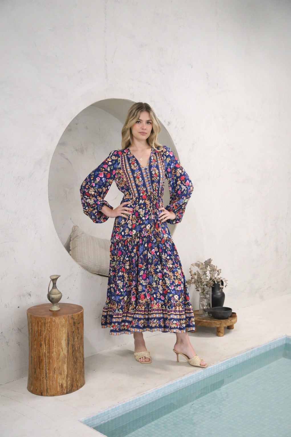 Long sleeve maxi dress, with drawstring and button up detail at the front.