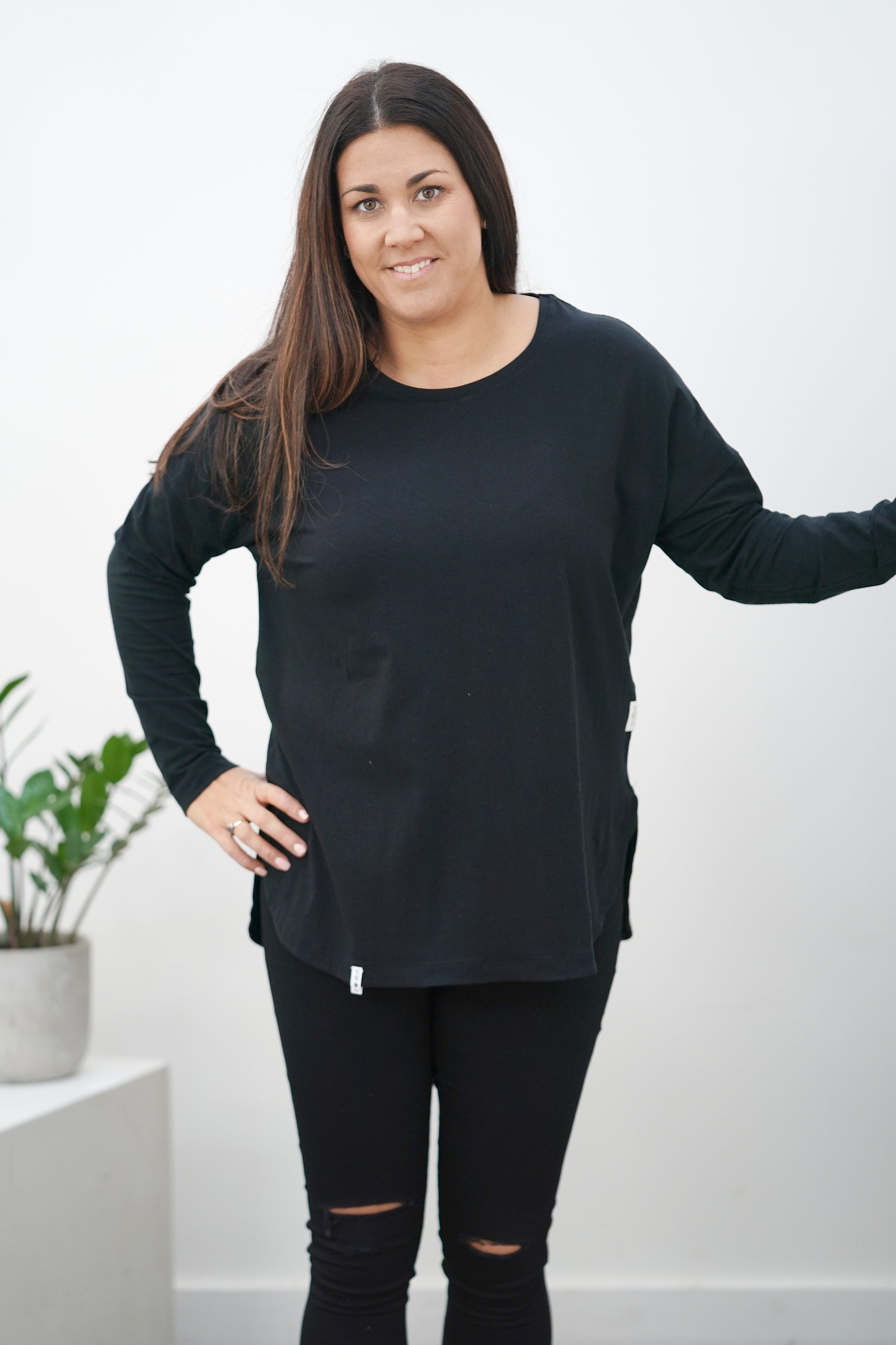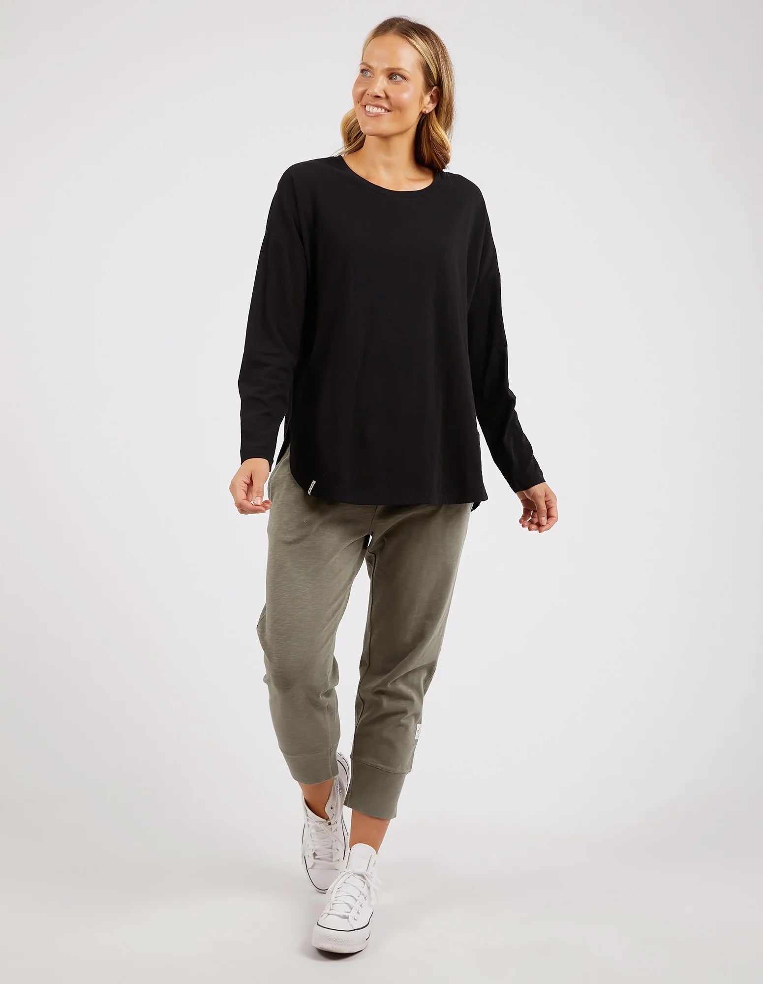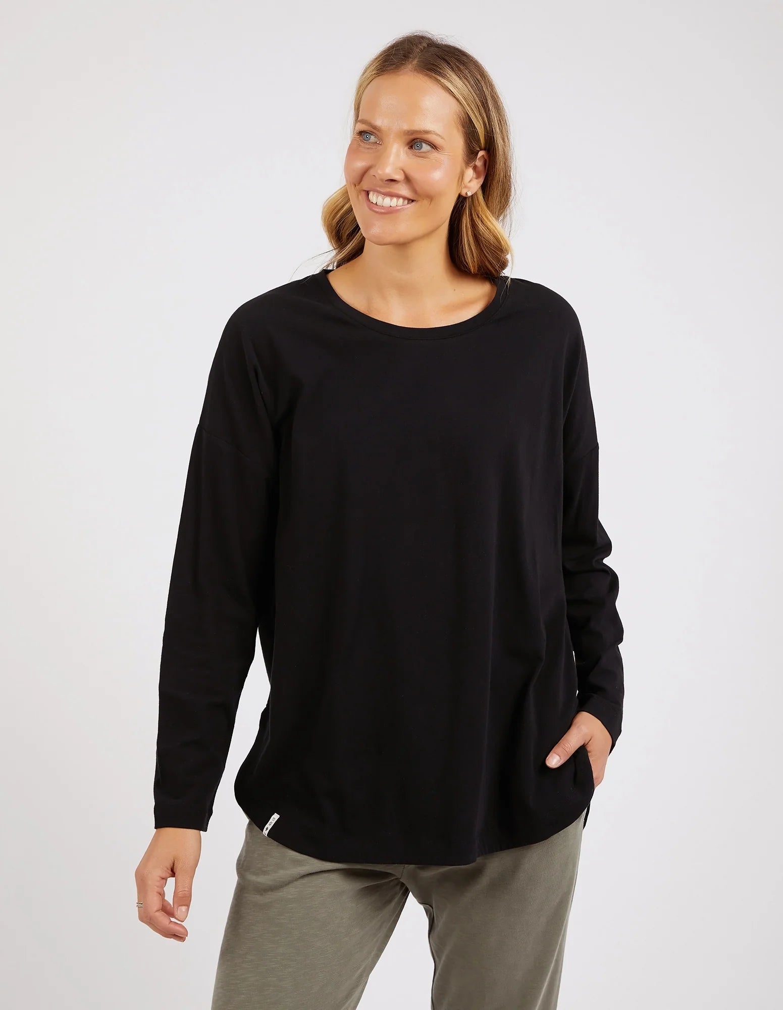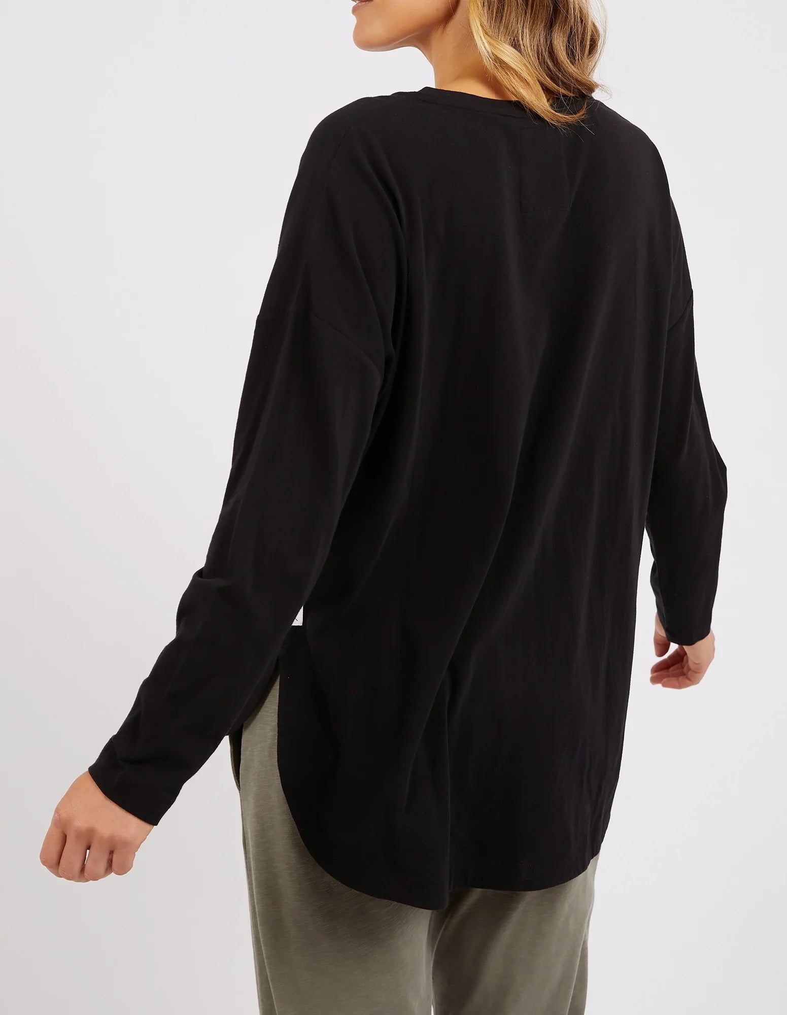 The Elm Society Long Sleeve Tee is a relaxed-fit, drop-shouldered, short-sleeved tee. Featuring a wide round neckline and a slightly rounded hem that falls longer and more heavily at the back making it ideal for layering.